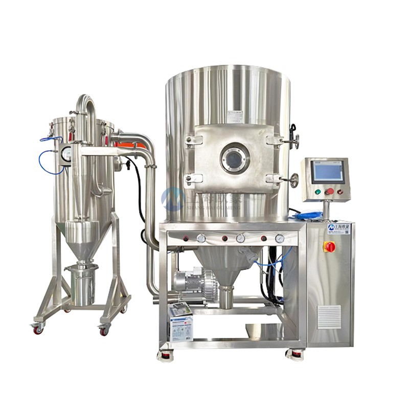 噴霧干燥機為開式循環(huán),并流式,離心式霧化。干燥介質(zhì)空氣經(jīng)過初、中效空氣過濾器過濾后根據(jù)操作指令由鼓風(fēng)機吸取再經(jīng)加熱器加熱通過高效過濾器的熱風(fēng)分配器進入噴霧干燥主塔。液體物料根據(jù)操作指令經(jīng)過蠕動泵,進入高速旋轉(zhuǎn)的離心噴頭,在離心力作用下被分散成小霧滴。在噴霧干燥主塔內(nèi),小霧滴與熱風(fēng)在充分接觸,沿其特定路徑進行熱交換后被干燥成為產(chǎn)品,然后通過旋風(fēng)分離器實現(xiàn)分離,固體物料被收集,氣體介質(zhì)再經(jīng)過過濾后被排出。整套噴霧系統(tǒng)易清潔、無死角,符合GMP要求。