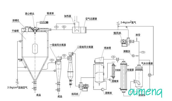 裝置**針對于有機(jī)溶劑,以使用循環(huán)氮?dú)舛纬傻亩栊詺怏w介質(zhì)取代通常的空氣介質(zhì),來進(jìn)行噴霧干燥。除了能回收產(chǎn)品之外,尚可回收有機(jī)溶劑。針對有機(jī)溶劑低閃點(diǎn)或者微毒的特點(diǎn),易燃易爆的特點(diǎn)**設(shè)計(jì)該套閉式循環(huán)噴霧系統(tǒng)。